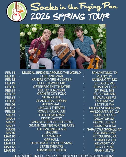 The “Socks in the Frying Pan” trio (from County Clare, Ireland) will begin their 2026 Spring Tour with a performance at the Musical Bridges Around the World event at Stable Hall in San Antonio, Texas on February 14th.